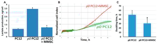 Retardation of glycolysis and higher proliferation in ρ0 PC12 cells associated with the transfer of mitochondria from MMSC. (A) Co-cultivation of MMSC and ρ0 PC12 cells was associated with lower production of lactate, possibly speeding ATP production from oxidative phosphorylation and blocking glycolysis, thus increasing the normalized cell index (B) and reducing the doubling time (C), which demonstrated the activation of proliferation in PC12 cells. All experiments were performed at least in triplicate; * denotes significant differences between groups (p < 0.05) (One-way ANOVA, followed by Tukey’s post hoc analysis). Values are given as mean ± standard error of the mean (SEM).