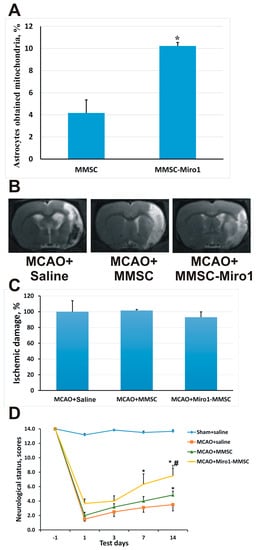 Beneficial effects of Miro1 overexpression on mitochondrial transfer. (A) Efficacy of mitochondrial transfer from MMSC overexpressing Miro1 to astrocytes after 24 h of co-cultivation; (B) Representative T2-weighted MR-images from coronal brain sections obtained 14 days after middle cerebral artery occlusion (MCAO). Hyperintensive regions refer to ischemic areas; (C) The volume of the ischemic lesions in the brain on day 14 after MCAO; (D) Effect of MMSC transplantation on the neurological status at different times after stroke. Intravenous injection with either native MMSCs or MMSC-Miro1 caused a significant decrease of the neurological deficit, with MMSC-Miro1 being more effective. *, p < 0.05 vs. ischemic saline controls; #, p < 0.05 vs. ischemic MMSC-treated rats. All cell culture experiments were performed at least in triplicate, and at least six animals were used for each group in the stroke study.