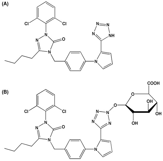 - Yan, B.; Wang, G.; Sun, J.; Li, X.; Zheng, Y.; Ai, H.; Lv, H.; Wu, X.; Xu, J. Identification of the major metabolites of 5-n-butyl-4-{4-[2-(1H-tetrazole-5-yl)-1H-pyrrol-1-yl]phenylmethyl}-2,4-dihydro-2- (2,6-dichloridephenyl)-3H-1,2,4-triazol-3-one, a new angiotensin type 1 receptor antagonist, in rat bile by HPLC-diode array detection-MS and HPLC-MS/MS. Biomed. Chromatogr. 2007, 21, 912–924. [Google Scholar] [PubMed]