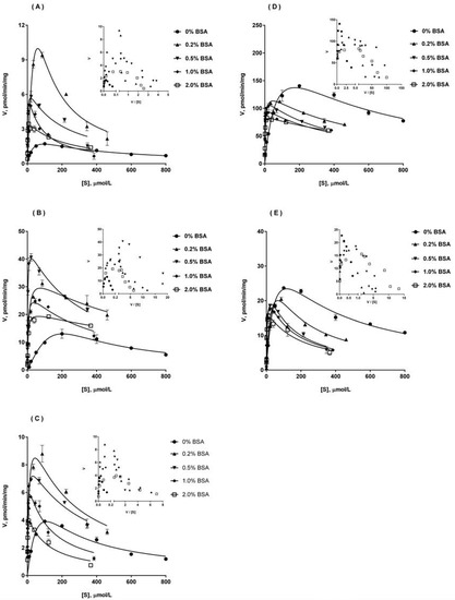 Atypical kinetic profiles for Ib glucuronidation in UGT1A9 (A), UGT2B4 (B), UGT2B7 (C), UGT1A3 (D) and UGT1A8 (E), in the absence and presence of BSA. Inset, Eadie-Hofstee plots for each of the profiles are shown. In the concentration of BSA at 0%, 0.2% and 0.5%, incubations were performed across 10 to 800 μM Ib concentration range. In the concentration of BSA at 1% and 2%, incubations were performed across 10 to 2000 μM Ib concentration range. The substrate concentration ([S]) in kinetic profiles refers to the unbound Ib concentration corrected by the free fraction (fu) of Ib. Each data point represents mean ± S.D. of triplicate determinations.
