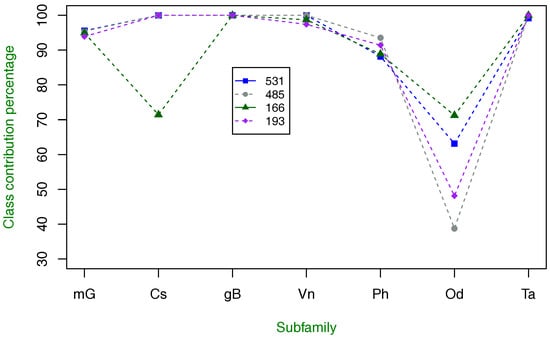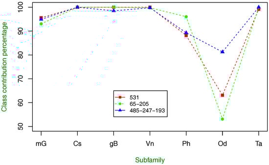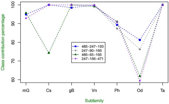 Class-specific percentage of contribution to overall classification using three amino acid property index combinations with the highest classification accuracy. As in Figure 2 and Figure 3, the tendency of index combination 485-247-193 is similar, but the recognition rate of the Od subfamily is highly improved.