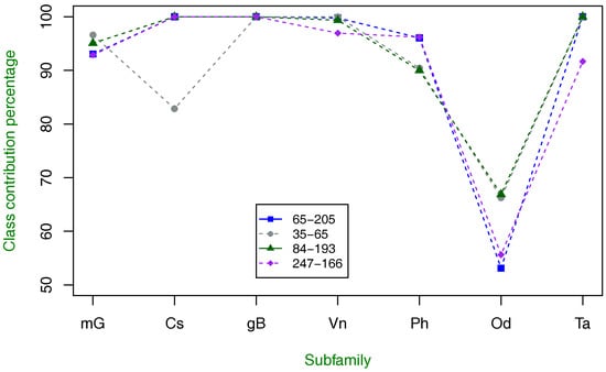 Class-specific percentage of contribution to overall classification using two amino acid property index combinations with the highest classification accuracy. The tendency of index combination results is similar to the results shown in Figure 2, but this time, the Ph and Od subfamilies are better discriminated.