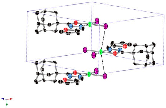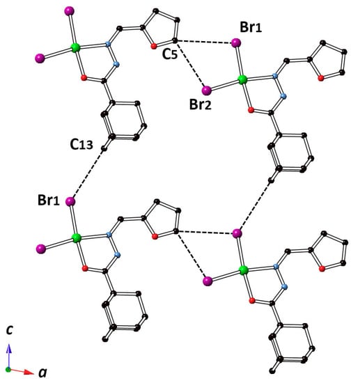 The coordination sphere of copper(II) consists of two bromides with an average Cu1–Br bond length of 2.372 Å, a hydroxyl oxygen Cu1–O2 of 1.987 Å, and Cu1–N1 of 2.067(10) Å. The Cu(II) is a square planar with Br1–Cu1–Br2 close to 90° (97.03(7)°). The furan and tertiary carbon in the adamantyl (C7) group and the amide arm (N2 and C6) are aligned in a coplanar disposition. All bond lengths and angles are in agreement with those reported for similar copper(II) complexes [,,]. The structure of crystal 1 is stabilized by the presence of hydrogen bonds between the bromine atoms and the L ligands (N2-H···O1, 2.665(2) Å). Figure 2 shows the packing of 1 and Figure 3 describes the 1D-layer formed from these weak interactions in 1.