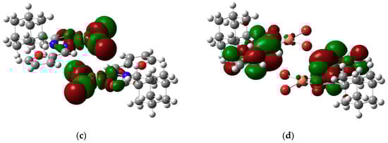 Presentation of the HOMO–LUMO in 1 obtained at 6-31G(d)/B3LYP of theory. (a) HOMO-1; (b) HOMO; (c) LUMO; (d) LUMO+1.