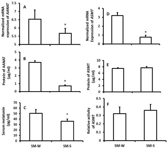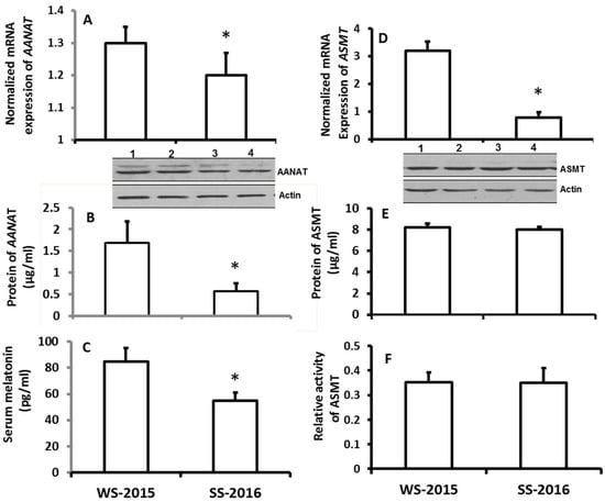 To investigate the potential association regarding the seasonal changes and the alteration of melatonin production, hamsters were selected due to their sensitivity to the changes of the photoperiod. Also, summer and winter were selected because they have the most distinguishable climates. In the first study, the animals were exposed to the natural climates of both seasons. It was found that the gene expressions of AANAT including their mRNAs and proteins in the pineal gland of hamsters were significantly upregulated in the winter compared the summer (Figure 1A,B).