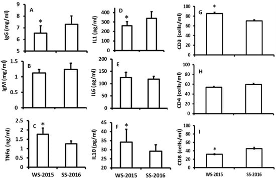 The effects of seasonal changes on the immuno-indexes including TNF-α, IgG, IgM, IL-1, IL-6, IL-10, CD3, CD4, and CD8 cells were investigated. The data indicated that there were no significant differences among IgM, IL-6 and CD4+ between the seasons (Figure 3B,E,H). The levels of TNF-α, IL-10, and CD3+ were significantly increased in the winter animals when they were compared to the summer animals (Figure 3C,F,G). In contrast, the levels of IgG, IL-1, and CD8+ were significantly lower in the winter animals than those of summer animals (Figure 3C,F,G).