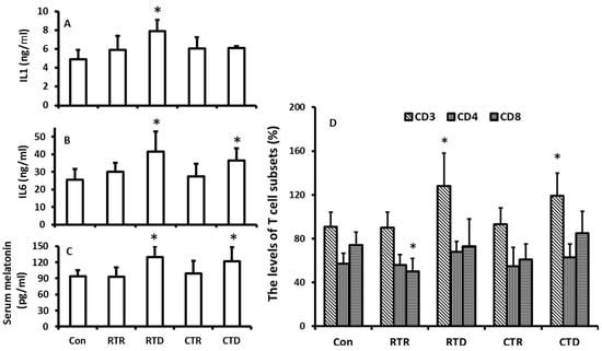 Temperature changes on the melatonin production and immuno-responses of hamsters. The animals were housed in the fixed ligh/dark cycle (12/12 h) and humidity but different temperature patterns. Con: 22 ± 2 °C; RTR: rapid temperature rising; RTD: rapid temperature drop; CTR: constant temperature rising and CTD: constant temperature drop, respectively. Animal were sacrificed after 72 h of the treatments at 9–10:00 pm under dim red light. Serum was collected for the further assays. A and B: the levels of IL1 and 6, respectively; C: the serum melatonin level, D: the distributions of CD3, 4 and 8 in different treatment groups. The data were expressed as means ± SDs of eight hamsters each group. * Significant difference vs. controls.