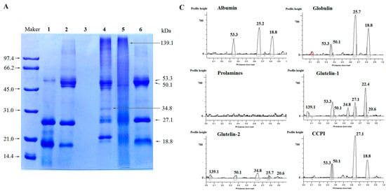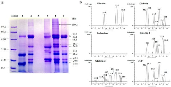SDS-PAGE patterns and molecular weight distribution profiles of coconut cake protein fractions in the absence (A,C) or in the presence (B,D) of β-mercaptoethanol. Maker: molecular weight standards; Track 1: albumin, 2: globulin, 3: prolamine, 4: glutelin-1 and 5: glutelins-2; 6: coconut cake protein isolates (CCPI).