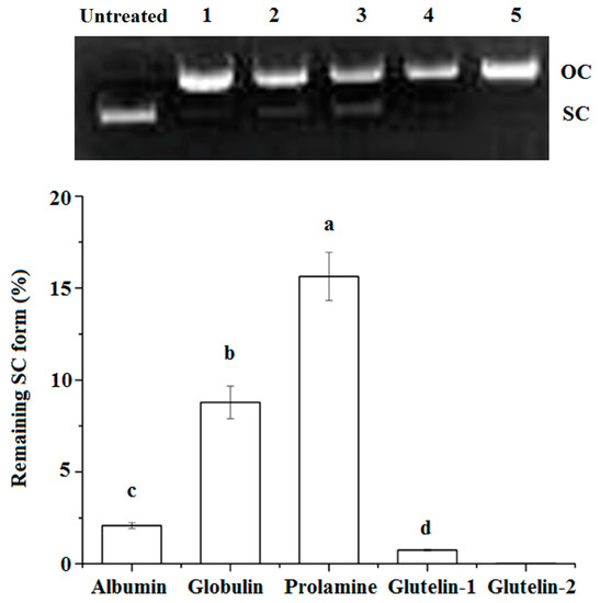 Protective effects of coconut cake protein fractions against DNA damage at 2 mg·mL concentration. SC, super-coiled form; OC, open-circular form; Different small letters a–d on the bar indicate significant difference (p < 0.05) in the comparison between samples.