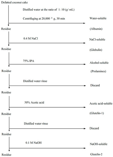 Prior the sequential fractionation described by Kwon et al. [4], the coconut cake was defatted three times with n-hexane (1:10, w/v), dried, ground and passed through a sieve of 0.2 mm mesh to obtain defatted coconut cake (DCC). Different solvents, including 0.4 mol·L−1 NaCl, 70% (v/v) 2-propanol (IPA), 50% (v/v) glacial acetic acid and 0.1 mol·L−1 NaOH, were used in sequence to extract the five fractions, and protocol was summarized in Figure 3. Correspondingly, water-, NaCl-, IPA-, acetic acid- and NaOH-soluble proteins were designated as albumin, globulin, prolamine, glutein-1 and glutein-2, respectively. Each fraction was extracted with a ratio of 1:10 (g·mL−1) after 8 h at 4 °C. After centrifugation at 20,000× g for 30 min, the supernatant was collected and dialyzed against deionized water at 4 °C for 48 h, and then lyophilized in a freeze dryer (LABCONCO 2.5, Kansas, MO, USA). Extraction with each solvent was carried out in triplicate, and all the resulting fractions were stored at −20 °C. Protein concentration of each fraction was determined by the Bradford method [21]. Coconut cake protein isolate (CCPI) was prepared following the method of Angelia et al. [5].