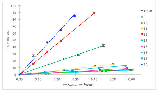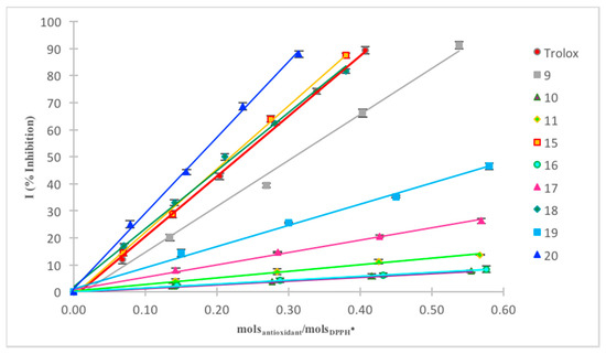 The assay was performed as described above, using acetonitrile as solvent (see experimental part for calibration curve of DPPH in ACN, SM). The absorbance measurements of each solution containing a known concentration of antioxidant and DPPH• were collected. Figure 3 depicted the plot of inhibition percentage versus molsantioxidant/molsDPPH• for the synthesized compounds 9–11 and 15–20.