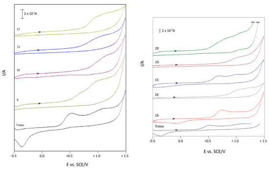 Voltammetric curves of compounds 9–11 and 15–20 (c = 2 × 10−3 M) in aqueous medium (H2O-0.5 M NaCl). Starting potential: −0.5 V; reversal potential: +1.5 V (GC working electrode, ν = 0.2 V·s−1, SCE reference electrode, 25 °C, N2).