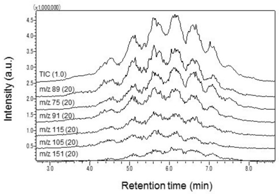 Relatively strong ion signals at m/z 75, 89 were commonly found that were specific to fragments of SCCP standard solutions. Besides the two predominant ions, signals at m/z 91, 105, 115, 125, and 151 were also found in the EI fragmentation of the SCCPs. Herein, a quantitative selected ion monitoring (SIM) analysis was performed over a wide bandwidth to cover all SCCPs related peaks and to compare the sensitivities of individual ions. As can be seen in Figure 2a and Supplementary Material Table S1, the ion signal sensitivities were in the order m/z 89 > 75 > 91 > 105 > 115 > 151. Previous studies selected a signal at m/z 91 (C4H8Cl) or 105 (C5H10Cl) as the target ion for the quantification of SCCPs [36]. When selecting a target ion in the lower m/z region, overlapping noise levels on each ion signal ought to be examined in detail to secure a reliable result. In this regard, overlapping noise levels in the SCCP peak area were examined with various polymer materials and the results are summarized in Figure 2b. Of all the ion signals, those at m/z 75 and 89 were less influenced by the overlapping background signal. In view of this result, the ion signal at m/z 89, rather than at m/z 91 or 105, was selected as the target ion for SCCP quantification.