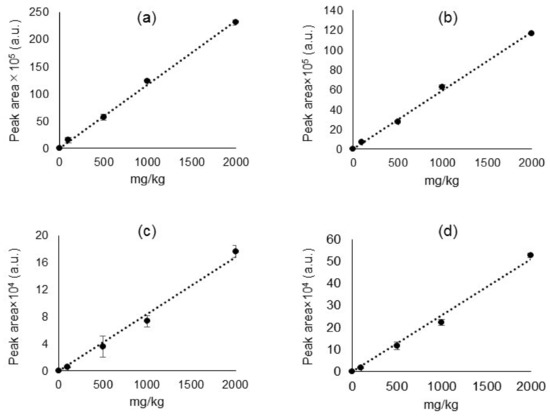 Calibration curves of (a) DEHP (m/z 279); (b) SCCPs (m/z 89); (c) HBCDD (m/z 319), and (d) DecaBDE (m/z 799), each 5-point calibration by 0, 100, 500, 1000, and 2000 mg/kg. Error bars represent the average of three repeated measurements.