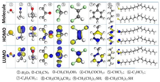Copper (Cu) and its alloys have been widely used in many industrial sectors, including electronic, chemical, and ocean engineering [1]. Despite its many outstanding properties, Cu is very chemically active, and is thus prone to corrosion. Serious corrosion not only leads to grave economic loss, it also poses a potential threat to human life [2,3,4]. Various ways to protect metals from corrosion have been developed based on different principles. Self-Assembled Monolayers (SAMs) are one of the most economic, highly efficient, and simple ways to protect metals and alloys from corrosion and oxidization [5,6,7]. Experimental research has been carried out to identify the protection mechanism of SAMs on Cu surfaces. It was generally believed that the densely packed monolayers were formed through chemisorption onto the surface of Cu [8]. Since the properties of the solvent affect the assembly of SAMs, the qualities of the SAMs formed in different solvents are expected to be different. Thus far, many researchers have studied the thiol-SAMs formed on gold surfaces in different solvents. Among them, Bain et al. evaluated the effect of various solvents (dimethylformamide, tetrahydropyranyl, ethanol, carbon tetrachloride, acetonitrile, hexadecane, cyclooctane, and toluene) on the formation of SAMs on gold surfaces. It was found that the hexadecanethiol monolayer adsorbed on gold in a hexadecane solution displays a low contact angle when it reaches certain thickness, which can possibly be attributed to the incorporation of hexadecane into the monolayer [9]. Dai et al. have reported the effects of solvents on the quality of the SAM of dodecanethiol on gold. They revealed that the solvent parameters (such as polarity, solubility, molecular size, octanol-water partition coefficients, and viscosity) affect the quality of the C12SH SAMs [10]. Ujjal et al. have also proposed that the nature of the solvent might affect the blocking properties and barrier characteristics of the –CH3 terminated SAMs [11,12]. Our previous experiments by electrochemical impedance spectroscopy, Fourier transform infrared spectroscopy, and X-ray photoelectron spectroscopy, showed that the qualities of self-assembled n-octadecanethiol (C18SH) indeed differ when it is formed in different solvents (n-hexane, toluene, trichloroethylene, chloroform, acetone, acetonitrile, and ethanol) [13]. Based on the experimental results, the assembly is likely to be a competitive adsorption process, containing interactions among the solvent, the solute, and the surface. However, which of these interactions plays an important role during the self-assembly process remains unclear due to the potential complexity of interactions among the different entities.