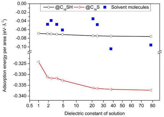 As shown in Figure 2, H2O adsorbs preferentially at the top site, with its molecular plane parallel to the surface. This result is consistent with a previous STM observation, which indicates an atop adsorption site [20]. Furthermore, the adsorption energy for water on a Cu surface is −0.51 eV, which is also consistent with the reported value of 0.51–0.55 eV [21], 0.54–0.57 eV [22], and 0.42 eV [23]. For the solvent molecules, elements O, N, S, and Cl are easily absorbed by the Cu atoms, because these atoms have many electrons and prefer the acidic Cu sites. Furthermore, it can be seen that only CH3CN is vertically adsorbed to the surface; others molecules are parallel to the surface. The covered area (the dotted black line in Figure 2) for C6H5CH3 and CH3(CH2)4CH3 is larger, due to their bigger molecule sizes. In order to obtain the strength of interaction between the Cu surface and different solvent molecules, the adsorption energy per unit area is plotted and compared, as shown in Figure 3. The adsorption energies are not much different for most solvent molecules and C18SH; this is in accordance with previous quantum chemical parameters, as indicated in Table 1. As we know, C18SH can be dissociated into C18S (after losing one H atom) on the substrate surface. Therefore, the adsorption of C18S is also considered in this paper [24]. As indicated in Figure 3, the adsorption energy per unit area of C18S decreases from −3.24 eV·Å−2 to −3.37 eV·Å−2 in solvents with an increased dielectric constant of 1 to 78.54. Therefore, the adsorption energy per unit area for C18S is much smaller than that for C18SH; this applies to the different solvent molecules as well. This indicates that C18S can be easily self-assembled on the Cu surface through competitive adsorption. Furthermore, the adsorption energy of C18S decreases in solvents with increased dielectric constant, which can well explain the previous experimental phenomenon that the C18S coverage on the Cu surface in the CH3CH2OH solution was higher than in the CH3(CH2)4CH3 solution at the assembly stage [13], as indicated in Figure S1.