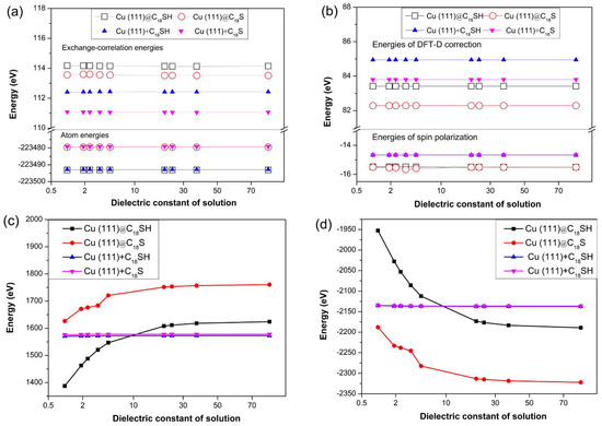 Based on Figure 4, the atomic energy, exchange-correlation energy, spin polarization and DFT-D correction energy are not greatly changed in different solvents. The electrostatic energies gradually increase while the kinetic energies decrease with increasing dielectric constant. Furthermore, the energies are not greatly changed if we sum the corresponding energy before adsorption, illustrating that the change is caused by the interaction between Cu (111) and C18SH (or C18S).