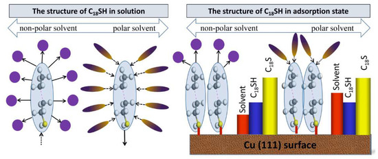Based on our previous results, the effect of solvent polarity on the quality of self-assembled C18SH on a Cu (111) plane can be illustrated in Figure 6.