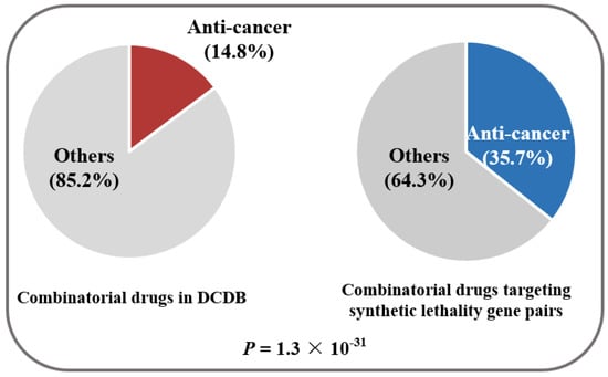 To perform this exploration, we first started with synthetic lethality genes. Synthetic lethality genes are gene pairs that lead to cellular or organismal death upon simultaneous mutations [15], which are considered to behave similarly to interacted genes. From the Synthetic Lethality Database (SynLethDB, https://labworm.com/tool/synlethdb), 19,952 synthetic lethality gene pairs for human tumors were collected with literature retrieval or theoretical prediction (available upon request) [15]. In a search of the Drug–Gene Interaction database (DGIdb, http://www.dgidb.org/), DrugBank (http://www.drugbank.ca) and the Therapeutic Target Database (TTD, https://db.idrblab.org/ttd/) [16,17,18], we identified combinatorial drugs that can target the synthetic lethality gene pairs. Through searching the DCDB [4], we found 342 documented combinations containing the predicted combinatorial drugs, 122 (35.7%) of which are efficient for treating cancer (Table S1). This ratio is significantly higher than the background ratio of anti-cancer combinatorial drugs in the DCDB [4] (14.8%, p = 1.3 × 10−31, hypergeometric test) (Figure 1). Therefore, it is concluded that these interacted genes are efficient sources of targets for combinatorial drugs.