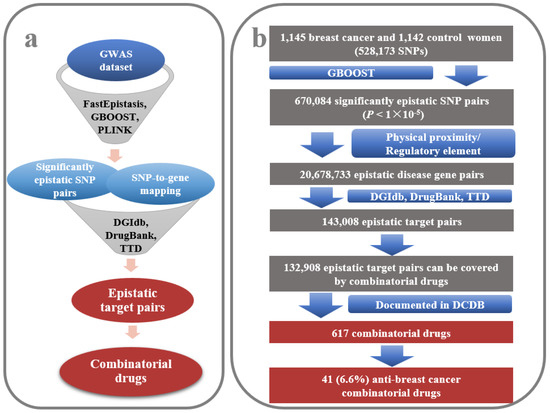 Pipeline for identifying epistatic target pairs in genome wide association studies (GWAS) and relevant combinatorial drugs. (a) The method for detecting significant epistatic target pairs and combinatorial drugs; (b) A case study by GBOOST. A total of 132,908 significantly epistatic target pairs can be hit by combinatorial drugs. The combinatorial drugs cover 617 of the combinations in the Drug Combination Database (DCDB, http://www.cls.zju.edu.cn/dcdb/), and 41 (6.6%) of them have clinical effects on breast cancer (p = 1.2 × 10−6, hypergeometric test).