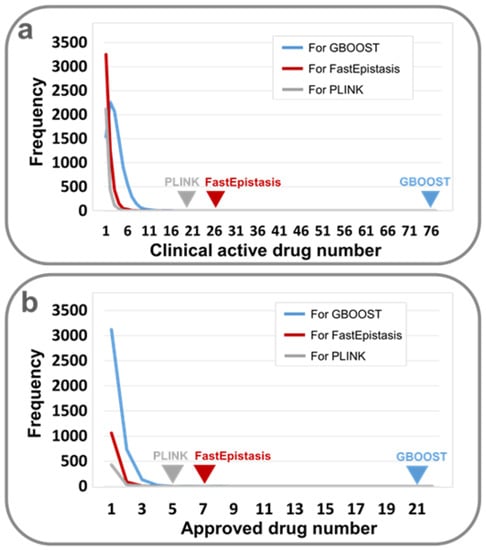 Frequency of clinically active/approved drugs hitting target pairs derived from GWAS: (a) for clinically active drugs; (b) for clinically approved drugs. Lines show the frequency of clinically active/approved drugs hitting target pairs derived from 10,000 random target combinations, where GBOOST, PLINK and FastEpistasis software were used to identify the epistatic target genes. Triangles indicate the number of active/approved drugs hitting epistatic target pairs calculated by GBOOST/PLINK/FastEpistasis software. It is evident that the epistatic target pairs are more promising as drug targets than random target combinations (p < 1 × 10−4, Permutation test).