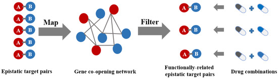 Pipeline for filtering epistatic target pairs by the co-opening network. Epistatic target pairs detected by three software packages were filtered with gene links that were considered to be functionally-related in the gene co-opening network. Then, a smaller number of functionally-related epistatic target pairs were left over. Finally, by targeting the filtered target pairs, drugs were combined after searching the Drug–Gene Interaction database (DGIdb, http://www.dgidb.org/), DrugBank (http://www.drugbank.ca) and the Therapeutic Target Database (TTD, https://db.idrblab.org/ttd/).