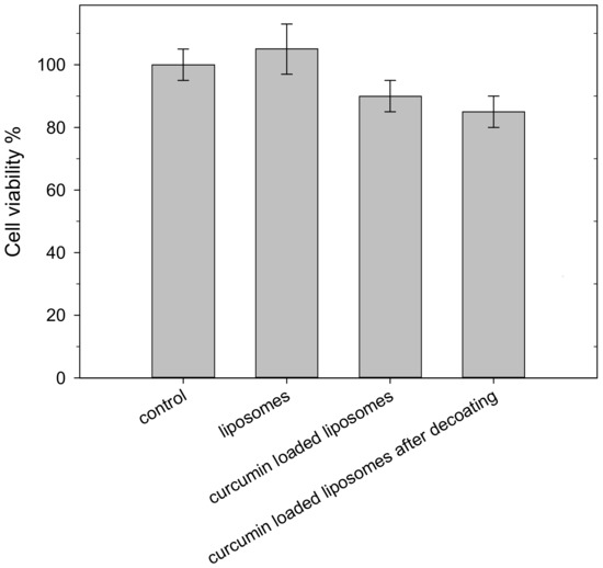 - Karewicz, A.; Bielska, D.; Loboda, A.; Gzyl-Malcher, B.; Bednar, J.; Jozkowicz, A.; Dulak, J.; Nowakowska, M. Curcumin-containing liposomes stabilized by thin layers of chitosan derivatives. Colloids Surf. B: Biointerfaces 2013, 109, 307–316. [Google Scholar] [CrossRef] [PubMed]