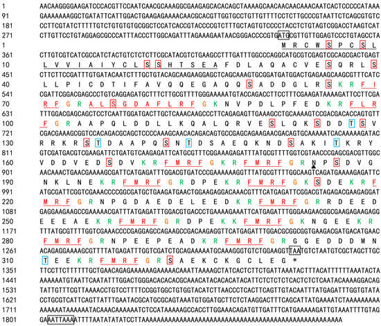 Full-length cDNA sequence and deduced amino acid sequence of SjFMRFamide from S. japonica. The putative signal peptide is underlined in black. The predicted FaRPs are marked in red and underlined. The basic or dibasic cleavage sites are green and the glycines used for C-terminal amidation are highlighted in orange. The putative start codon, stop codons, and the polyadenylation signal (AATAAA) are each enclosed in a box. An N-glycosylated site is indicated with a black triangle and phosphorylation sites are represented by solid lines in which serines are marked in red and threonines are highlighted in blue.