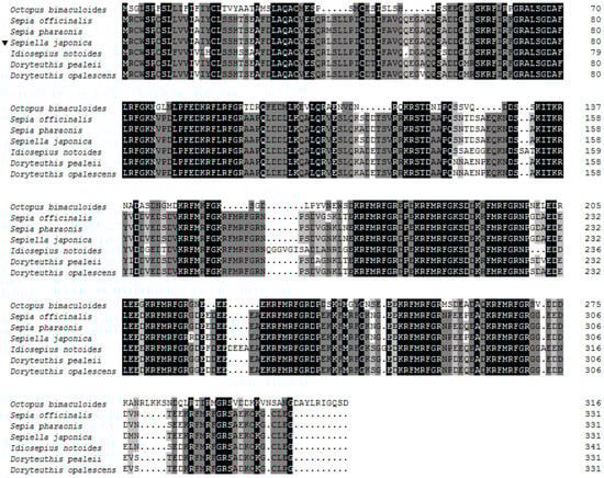 Multiple alignment of the deduced amino acid sequences of FMRFamides. Residues identical in all seven sequences are boxed in black. Conserved substitutions are boxed in gray. GenBank accession numbers of the sequences include: Octopus bimaculoides (XP_014775928.1), Sepia officinalis (CAA72116.1), Sepia pharaonis (AQM50872.1), Sepiella japonica (AJT49288.1), Idiosepius notoides (ACP39631.1), Doryteuthis pealeii (ACI22791.1), and Doryteuthis opalescens (AAG22544.1).