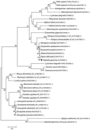 A second transcript (mRNA) coding for FaRPs has been found to exist in some mollusks. In Lymnaea stagnalis, mRNA 1 included exons E1 and E2 and mRNA 2 included exons E1, E3, E4, and E5 [27]. In H. aspersa, two mRNAs have also been characterized [28]. The phylogenetic tree (see Figure 3) showed that SjFMRFamide grouped with almost all the mollusks and clustered together as a subgroup. S. japonica has a tight evolutionary relation with S. officinalis and S. pharaonis. The second transcripts of FMRFamides from arthropods acted as an outgroup. Until now, the second mRNA of the FMRFamide gene has not been identified in cephalopods.