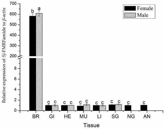 Distribution of SjFMRFamide mRNA in different S. japonica tissues.The analyses were conducted in eight different tissues including the brain (BR), gill (GI), heart (HE), muscle (MU), liver (LI), sexual gland (SG, including testis & ovary), nidamental gland (NG), and accessory nidamental gland (AN). β-Actin served as a reference gene. Different letters on the bars represent statistically significant differences among the tissues in the LSD multiple comparison test of SPSS [31] (p < 0.05).