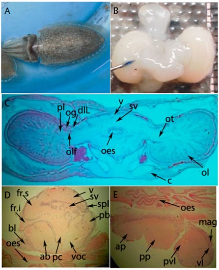 Brain structure of S. japonica [33]. (A) A whole figure of live S. japonica, (B) fresh brain after dissection (the needle points to the location of optic gland in the brain), (C) transection of the brain (the above part is the cuttlefish back), (D) supraesophageal mass (longitudinal section, left side is anterior), (E) subesophageal mass (longitudinal section, left side is anterior). Abbreviations: pl, peduncle lobe; og, optic gland; dlL, dorsal lateral lobe; olf, olfactory lobe; v, vertical lobe; sv, subvertical lobe; oes, esophagus; ot, optic tract; ol, optic lobe; c, cartilage; fr.s, superior frontal lobe; fr.i, inferior frontal lobe; bl, brachial lobe; ab, anterior basal lobe; pc, precommissural lobe; voc, ventral optic commissure; spl, subpeduncle lobe; pb, posterior basal lobe; ap, anterior pedal lobe; pp, posterior pedal lobe; pvl, palliorisceral lobe; mag, magnocellular lobe.