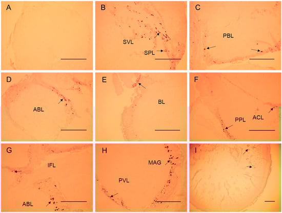 Localization of SjFMRFamide mRNA in the brain of S. japonica. (A) A medial sagittal section of the anterior basal lobe stained with the sense SjFMRFamide probe, (B) the sub-vertical lobe, (C) posterior basal lobe, (D) anterior basal lobe, (E) brachial lobe, (F) posterior basal lobe, (G) inferior frontal lobe, (H) parabrachial lobe, and (I) optic lobe. Abbreviations: ABL, anterior basal lobe; ACL, anterior chromatophore lobe; BL, brachial lobe; IFL, inferior frontal lobe; MAG, magnocellular lobe; PBL, posterior basal lobe; PVL, palliorisceral lobe; SFL, superior frontal lobe; SPL, subpeduncle lobe; SVL, subvertical lobe. The black arrows indicate positive signals. Scale bars: 500 μm.