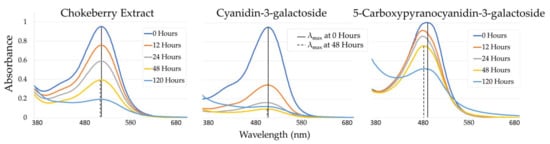 Degradation kinetics were evaluated in terms of change in maximum absorbance of the solutions at the original λvis-max over time. Bleaching has been previously reported as a first-order reaction, typical of ACN degradation, and was modeled as such in determining the reaction rate and half-life [24,25]. The decrease in maximum absorbance correlated with an increase in lightness (L*) as well as the decrease in chroma (c*) for all pigments. The reduction in maximum absorbance closely followed first-order kinetics for all treatments with an R2 higher than 0.94 for control treatments and 0.96 for samples with added ascorbic acid. The kinetics results for each pigment and AA level can be found in Table 1. Without ascorbic acid, 5-Carboxypyranocyanidin-3-galactoside had the greatest half-life (978 h), followed by chokeberry extract (858 h), and then Cyanidin-3-galactoside (546 h). Addition of ascorbic acid dramatically reduced half-lifes for all pigments. With 1000 mg/L AA added, the 5-Carboxypyranocyanidin-3-galactoside half-life was 64 h; chokeberry extract had a half-life of 24 h; and Cyanidin-3-galactoside had a half-life of 8 h, seen in Table 1.