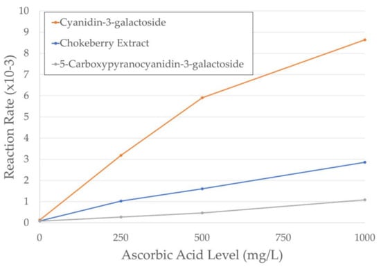 The relationship between ascorbic acid level and the reaction rates was additionally assessed to observe how each of these pigments responds to ascorbic acid addition. A linear relationship was found and can be seen in Figure 3. The R2 values for these pigments at varying AA levels are the following: chokeberry extract, 0.99; Cyanidin-3-galactoside, 0.96; and 5-carboxypyranocyanidin-3-galactoside, 0.98. Linearity is lost to some degree for Cyanidin-3-galactoside with 1000 mg/L AA addition. The slope could be effectively regarded as how responsive (or deleterious) the change in pigment solution maximum absorbance is upon AA addition, with a higher slope indicating greater susceptibility to AA. The slope of Cyanidin-3-galactoside was 3.1× that of chokeberry extract and, in comparison to 5-carboxypyranocyanidin-3-galactoside, cyanidin-3-galactoside was 8.2× and chokeberry extract 2.7× more suspectible.