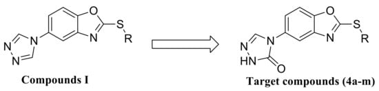 In our previous study, we reported the synthesis and anticonvulsant activity of 2-thioalkyl-5-(4H-1,2,4-triazol-4-yl)benzo[d]oxazoles (Figure 1, I) [7]. This series of compounds exhibited potent anticonvulsant activities. Among them, 2-(3-fluobenzyl)thio-5-(4H-1,2,4-triazol-4-yl)benzo[d]oxazole was the most potent with an ED50 value of 11.4 and 31.7 mg/kg in maximal electroshock seizure (MES) and subcutaneous pentylenetetrazole induced seizure (sc-PTZ) models, respectively. Preliminary research investigating the mechanism of action suggested that the GABAergic system may contribute to the anticonvulsive action of this compound. As a continuation of the above study, in the current study, a series of benzoxazole derivatives containing triazolone (4a–m) were designed and synthesized, which replaced the triazole in compounds of I with triazolone. This design is based on a hypothesis that the carbonyl group in the triazolone may increase the affinity to the receptor, and thus increase the anticonvulsant activity, which has already been confirmed in previous studies [8,9].