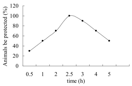 From the data in Table 1, it can be seen that some compounds, including 4g, remained active until the 4 h time point. This indicates that these compounds possessed anticonvulsant activity with protective effects for a long duration. To evaluate the anticonvulsant activity of 4g more accurately, the time to peak effect (TPE) was tested. Compound 4g reached the TPE at 2.5 h after i.p. administration (Figure 2). Therefore, the 2.5 h time interval was chosen as the assessment time for compound 4g in further quantification tests.