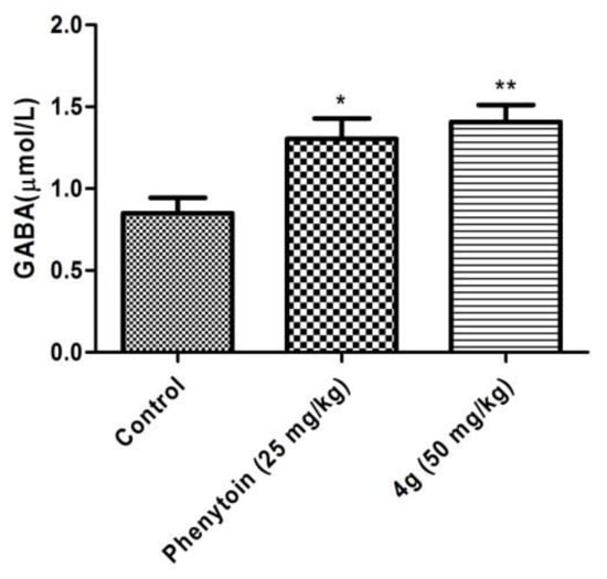 Effect of 4g and phenytoin on whole brain GABA concentration in mice. Data are presented as mean ± SEM. of six animals. * p < 0.05, ** p < 0.01 vs. control (animals treated with saline).