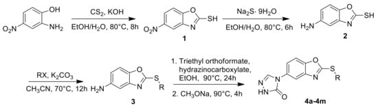 The target compounds were synthesized according to Scheme 1. The starting material, 2-amino-5-nitrophenol, was reacted with CS2 to obtain compound 1, which was reduced further by Na2S·9H2O in ethanol to obtain compound 2 [12]. Alkylation of compound 2 with a variety of different alkylating agents produced compounds 3, which were then treated with triethyl orthoformate and methyl hydrazine carboxylate in the presence of sodium methoxide to give rise to the target compounds 4a–m [13]. The chemical structures of these compounds were characterized using 1H-NMR, 13C-NMR, and mass spectrum (MS) analysis techniques. A detailed overview of the physical and analytical data from these compounds has been provided in the Materials and Methods section.