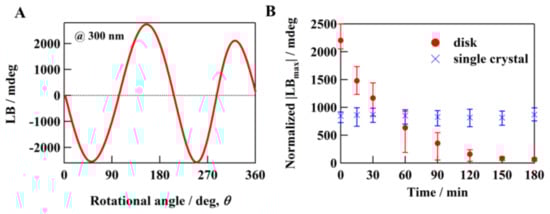 Ten disks with identical thicknesses (0.7 mm) for a KBr, KCl, or KI matrix were studied. Figure 1A shows a representative (typical) LB rotational measurement result for a 50-kHz signal at 300 nm, which was obtained by rotating a KBr disk mounted on the sample rotation holder. Note that a 50-kHz signal obtained with a polarizer can generally be regarded as an LB signal, because the single-order term, LB, is much larger than the second-order term, LD, as shown in Equation (S14) (Supplementary Materials). As expected, when a light beam was incident on the freshly prepared KBr disk, being exactly normal to the wide face, a strong LB signal with sin2θ periodicity appeared in the LB rotational measurements (Figure 1A). This result is evidence that the KBr disk has extrinsic or intrinsic OA. In contrast, when the light beam was incident on a KBr crystal pressed at 100 MPa/cm2 in a hexane solution, exactly normal to the (100) face, a weak LB signal was detected in the LB rotational measurements. The shape was a trigonometric function (data not shown). Thus, it is clear that cubic KBr single crystals exhibit intrinsic birefringence even though these crystals constitute an isometric system. The birefringence of KBr disks has stronger angular dependence than that of single crystals, which is in agreement with experimental results that cubic single crystals possess intrinsic birefringence even though they belong to an isometric system [10].