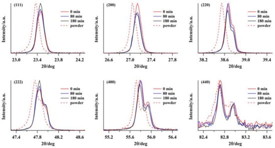 Figure 2 shows the time-dependent variations in the XRD patterns of the alkali halide KBr disk at several representative diffraction peaks, i.e., (111), (200), (220), (222), (400), and (440), under exposure to air. This behavior was monitored in 40-min intervals from the initial state (0 min), which occurred immediately after pressure release. For all diffraction peaks, small changes in these intensities and the full width at half maximum (FWHM) were observed with time. The FWHM was dependent on the particle size (coherent scattering regions) and strain induced in the individual crystal lattice. The FWHMs gradually became ~10–20% narrower than those of the initial state, and diffraction peak shifts from the initial values to higher diffraction angles were concomitantly observed. Thus, these results indicate that the disk formation processes alter the cubic crystal lattice to another form. Immediately after pressure release, however, the interatomic distance begins to gradually shorten, ultimately returning to the original cubic distance. The correlation of the intensity changes with the long-term relaxation of the SIB was also obtained. It was found that, when the intensities of the (111) and (222) diffraction peaks decrease, those for the (200) and (400) peaks increase in contrast, and vice versa. Thus, a crystallite reorientation within the disk structure occurs, which may be attributed to the quasi-amorphous transformation in the crystallite boundaries, as shown below. Thus, the XRD analysis supports the hypothesis that the observed nonlinear relaxation of the SIB originates from the extrinsic OA.