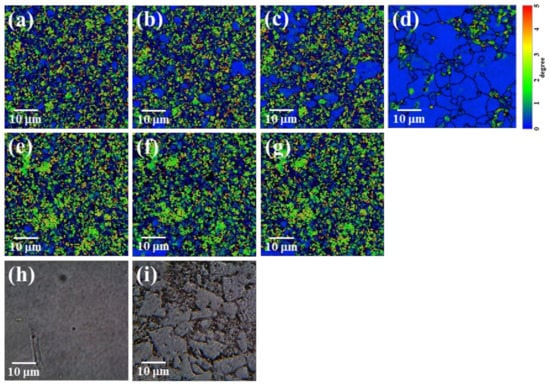 Time-course local misorientation of crystalline KBr in disk measured by electron backscattering diffraction (EBSD) for open-air storage: (a) 20 min; (b) 50 min; (c) 120 min; (d) 13 h; and for vacuum storage: (e) 30 min; (f) 80 min; (g) 180 min. Optical microscope images of a KBr disk for the open-air storage case: (h) 0 min; (i) 180 min. The EBSD measurements were conducted in a high-vacuum SEM chamber.