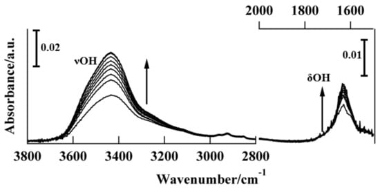Time-course variations of absorption FT-IR spectra for water adsorption on a KBr disk (15-min intervals). The arrows indicate the direction of the spectral intensity evolution with time.