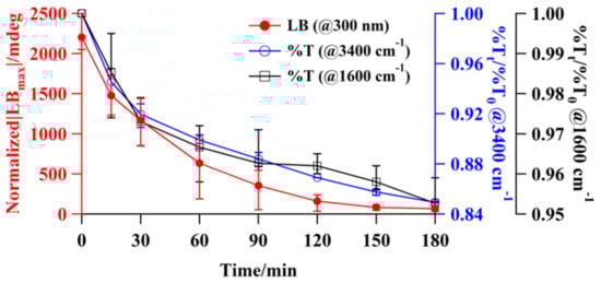 Recovery process of stress-induced LB values (@ 300 nm) of a KBr disk at plus LBmax positions, transmission at νOH stretching (3400 cm−1), and δOH bending mode bands (1600 cm−1), all plotted as functions of time to indicate the adsorption events of the water molecules on the disk. %Tt and %T0 are FT-IR transmittance at the intermediate and initial stages at the relaxation process, respectively. The data points indicate the mean values (n = 10) with standard deviation bars.