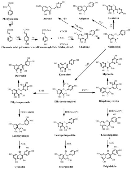 Classification and biosynthisis of flavonoids in plant (ANS = Anthocyanid in synthase; AS = Aureusidin synthase; C4H = Cinnamate-4-hydroxylase; CHI = Chalcone isomerase; 4CL = 4-coumaroyl: CoA-ligase; CHS = Chalcone synthase; DFR = Dihydroflavonol 4-reductase; F3H = Flavanone-3-hydroxylase; F3′H = Flavonoid 3′-hydroxylase; F3′5′H = Flavonoid 3′5′-hydroxylase; FLS = Flavonol synthase; FSI = Flavone synthase; IFS = Isoflavone synthase; PAL = Phenylalanine ammonia lyase; THC4′GT = UDP-glucose: tetrahydroxychalcone 4′GT).