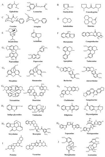 Classification of alkaloids in plant. (A): Amines; (B): Pyrrolidines; (C): Tropanes; (D): Piperidines; (E): Terpenoid; (F): Quinolines; (G1): 1-Benzylisoquinoline; (G2): Aporphines; (G3): Morphinane; (G4): Protoberberine; (G5): bisbenzylisoqunolines; (G6): Benzophenanthridines; (H1): Simple indoles; (H2): Tryptamine indoles; (H3): Monoterpenoid indoles; (H4): Bisindole alkaloids; (I): Steroidal alkaloids; (J): other alkaloids.