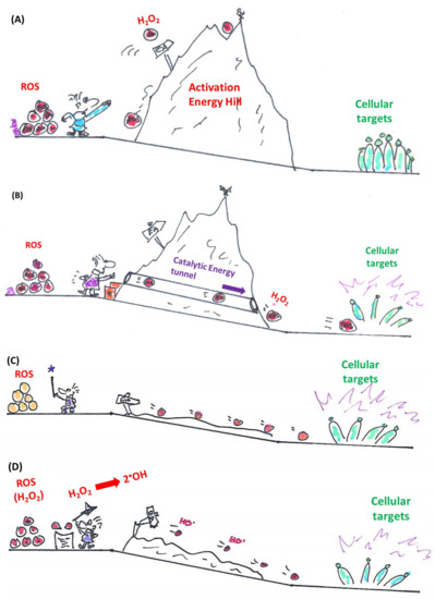 Cartoon illustrating the “catalytic principle” in the context of cellular processes. Inside cells various reactions are unfavourable kinetically and therefore possible yet slow (A). A suitable catalyst can accelerate such reactions significantly by “tunnelling through” the activation energy hill (B). It should be noted that this “catalytic tunnel” is not open to all kind of substrates, hence catalysts also provide a degree of selectivity (in this case for H2O2). Besides such direct catalytic interferences with cellular targets, certain catalysts are also able to deplete the cell of essential components, such as GSH or NAD(P)H or convert certain cellular components into natural or even unnatural, cytotoxic substances which react more rapidly with their cellular targets (C). A special and particularly attractive case is the interconversion of ROS (D).