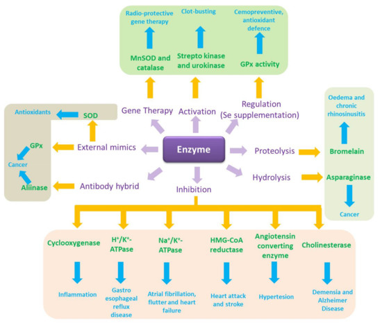 Less invasive alternatives are considering the controlled overexpression of enzymes from already existing genes. In fact, certain studies have demonstrated the prospect to increase the expression of enzymes by external stimulus, similar to the “induction” of protein expression in the liver or in bacterial cultures with the notorious isopropyl β-d-1-thiogalactopyranoside [40]. Glutathione peroxidase and thioredoxin reductase activity in the body can be increased, for instance, via an increased intake of dietary selenium [41,42,43]. Compared to gene therapy, this avenue towards increased amounts and activities of certain enzymes appears to be rather simple and mild, and is interesting, especially in the context of chemoprevention, food supplementation and quality of life in the elderly. Nonetheless, such primitive nutritional approaches are limited in scope. Concentrations of the relevant enzymes cannot be increased by large margins, the method is neither specific for just one desired enzyme or location, and in any case is limited to a handful of known examples. It is also somewhat difficult to control in practice, with over-supplementation of substances such as selenium representing a tangible risk.
