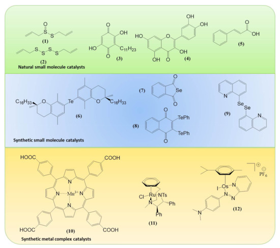Chemical structures of the most important agents and catalysts discussed. allicin (1), diallyltetrasulfide (DATTS) (2), embelin (3), quercetin (4), cinnamic acid (5), 7,7′-tellurobis-ß-tocopherol (6), benzo[c]selenophene-1,3-dione (7), 2,3-bis(phenyltellanyl)naphthalene-1,4-dione (8), 1,2-di-(quinolin-8-yl)diselane (9), Mn(III)tetrakis(4-benzoic acid)porphyrin (10), (R,R)-[Ru(η6-C6H5(CH2)3Ts DPEN-N-Me)Cl] (11) and [Os(η6-p-cymene)(4-(2-pyridylazo)-N,N-dimethylaniline)I]PF6 (12).
