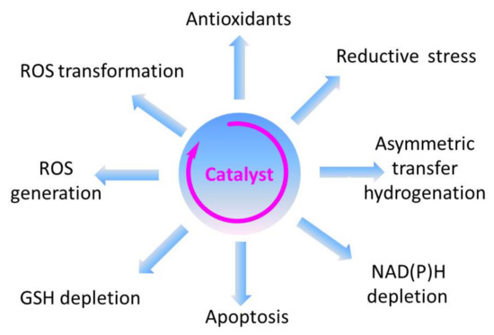 Secondly, ROS are a fine choice of (pre- or pro-)cytotoxic agents as they tend to damage a wide range of biomolecules, yet in a controlled manner, which leads to cellular signalling and not simply to “poisoning”, as in the case of unnatural catalysts and products. Indeed, catalysts generating or employing ROS operate with “natural” oxidative stressors. Their impact on cells is therefore dramatic, yet paradoxically also controlled—often proceeding via distinctive signalling pathways and ending in programmed cell death, i.e., apoptosis. This implies that any catalyst promoting such damaging reactions would not only be highly effective, but also highly selective. It would act exclusively in the presence of ROS and cause damage via existing cellular pathways and without any major damage to normal cells or poisoning of the surrounding tissue and organism.